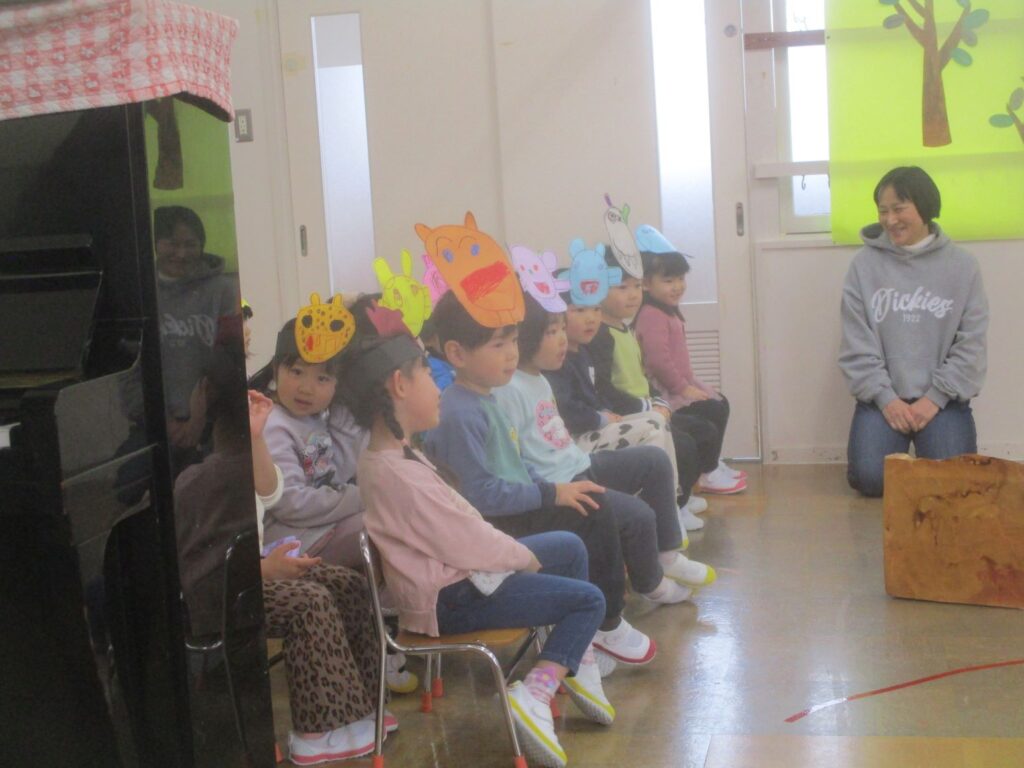 年少組の生活発表会が行われました。 「どうぶつもりのかくれんぼ」 どうぶつたちがかくれんぼをして遊んでいます。 「♪どうぶつさん どうぶつさん かくれんぼしよう♪」 今日はどこにか …