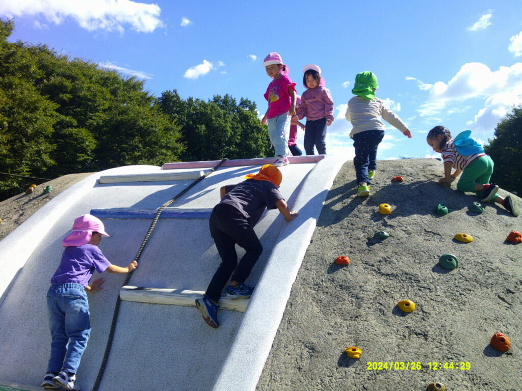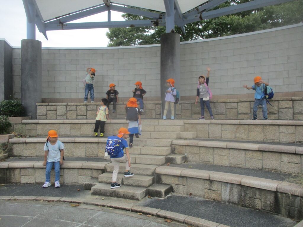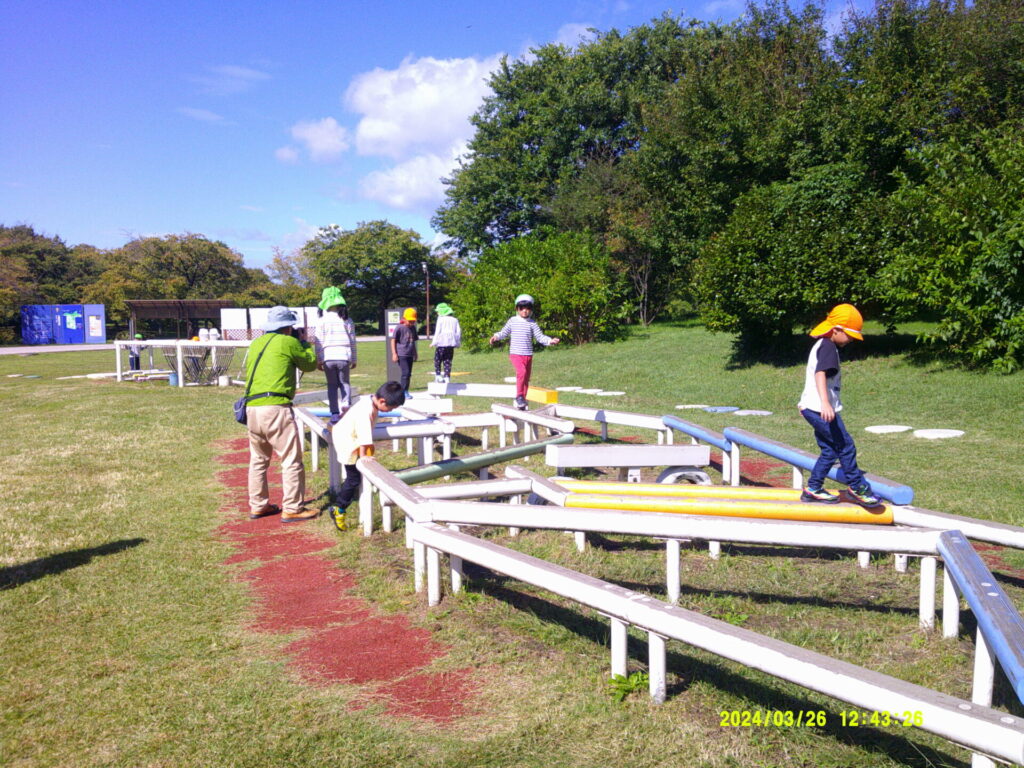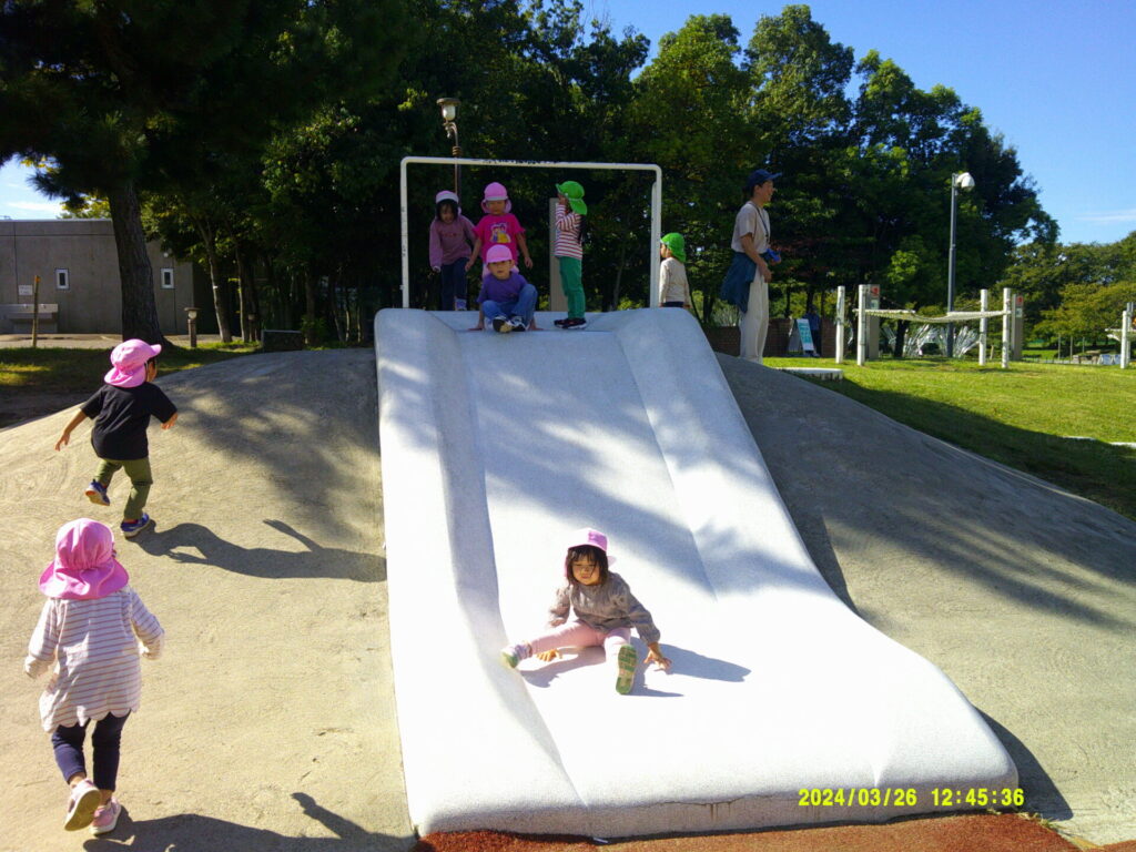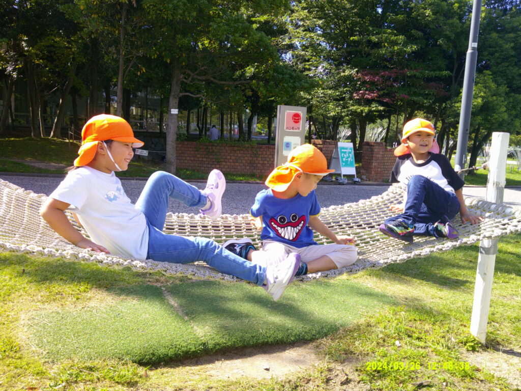 スポーツ公園の林の中を歩いて遊具広場へ向かいました。たくさんの遊具があって、みんな大喜び。「よーし、遊ぶぞ。」「どの遊具から遊ぼうかな。」と張り切って遊びに行きました。