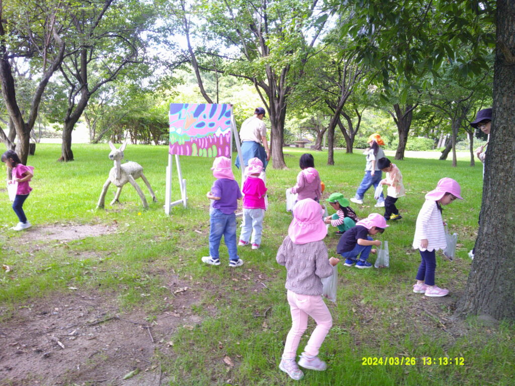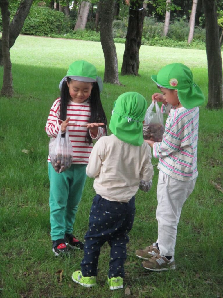 遊具広場の隣の林の下には大きなまん丸いドングリがたくさん落ちていました。「ここにもあるよ。」「あっちにもあるよ。」みんなが夢中になって拾いました。