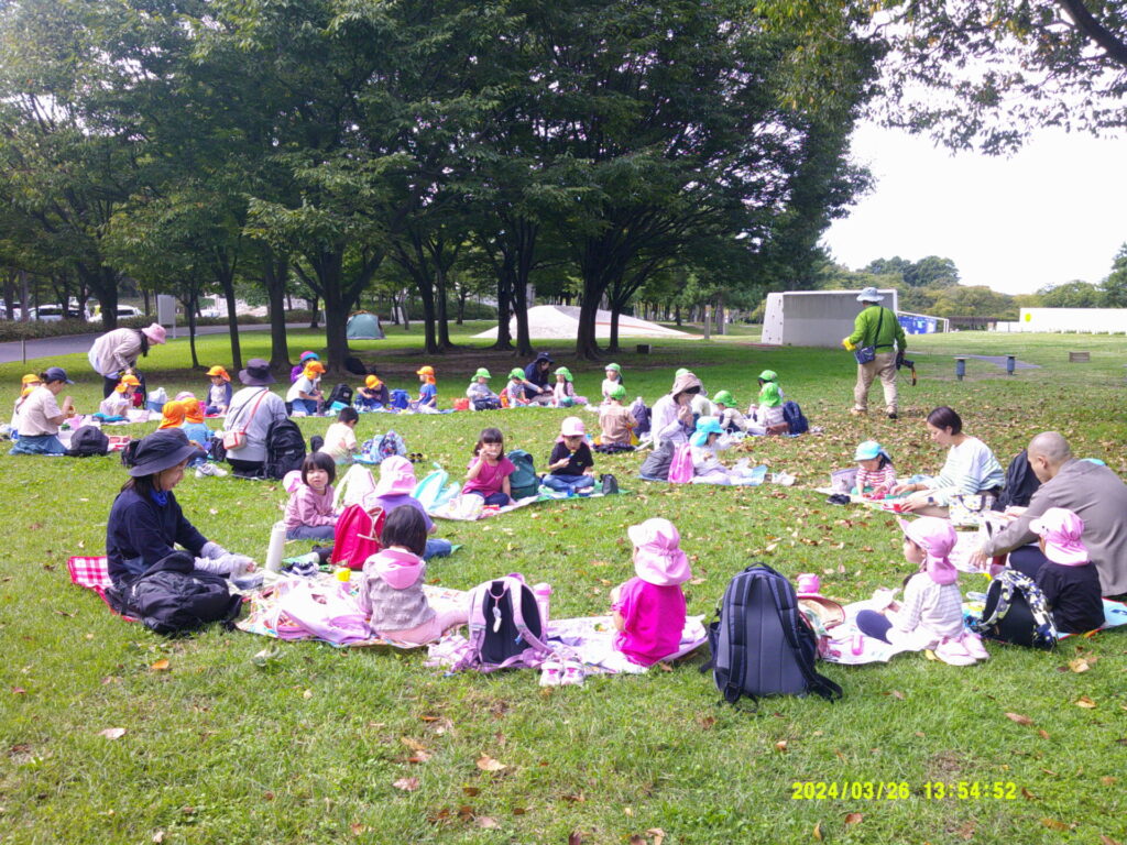 たくさん遊んだ後は、お楽しみのお弁当の時間です。みんな大きな口でパクパク食べていました。