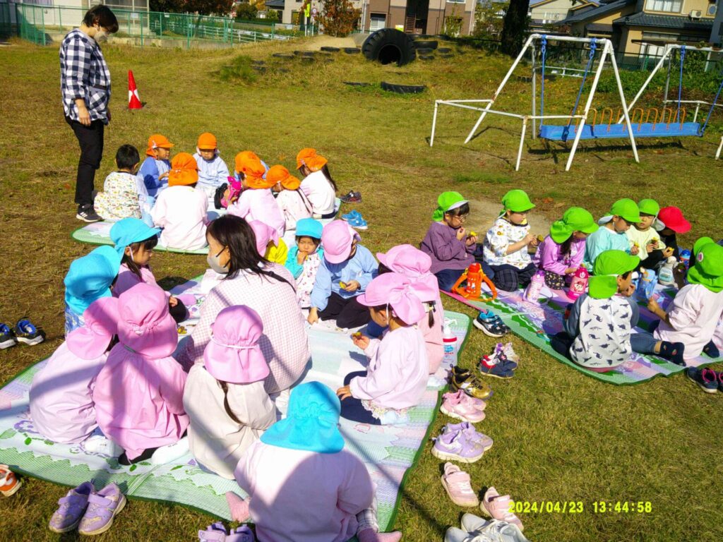 この日は焼き芋日和のいいおお天気。園庭に敷物を敷いて、みんなで焼き芋をいただきました。