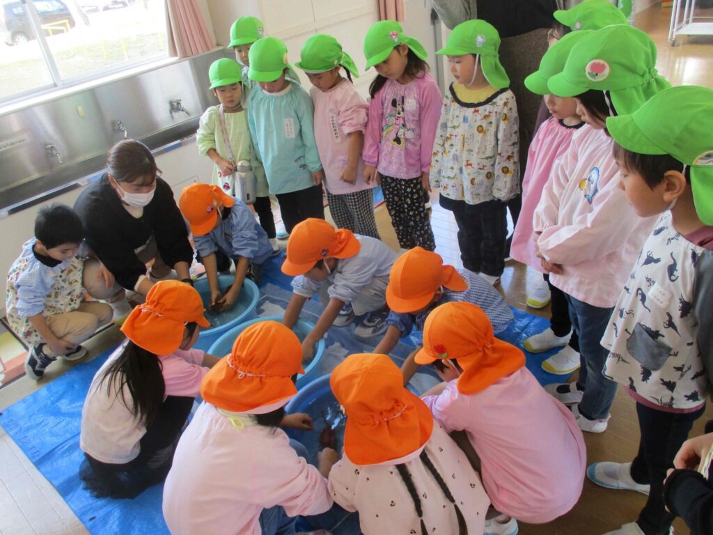 年少たんぽぽ組さんといちご組さんもやってきて、お芋の準備を応援してくれました。