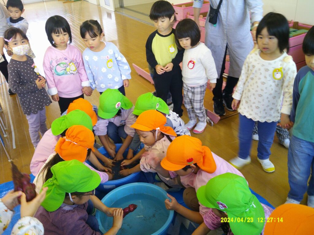 次はお芋の準備です。お芋についた泥を丁寧に洗っていると、「何してるの?」と年中もも組さんがやってきました。