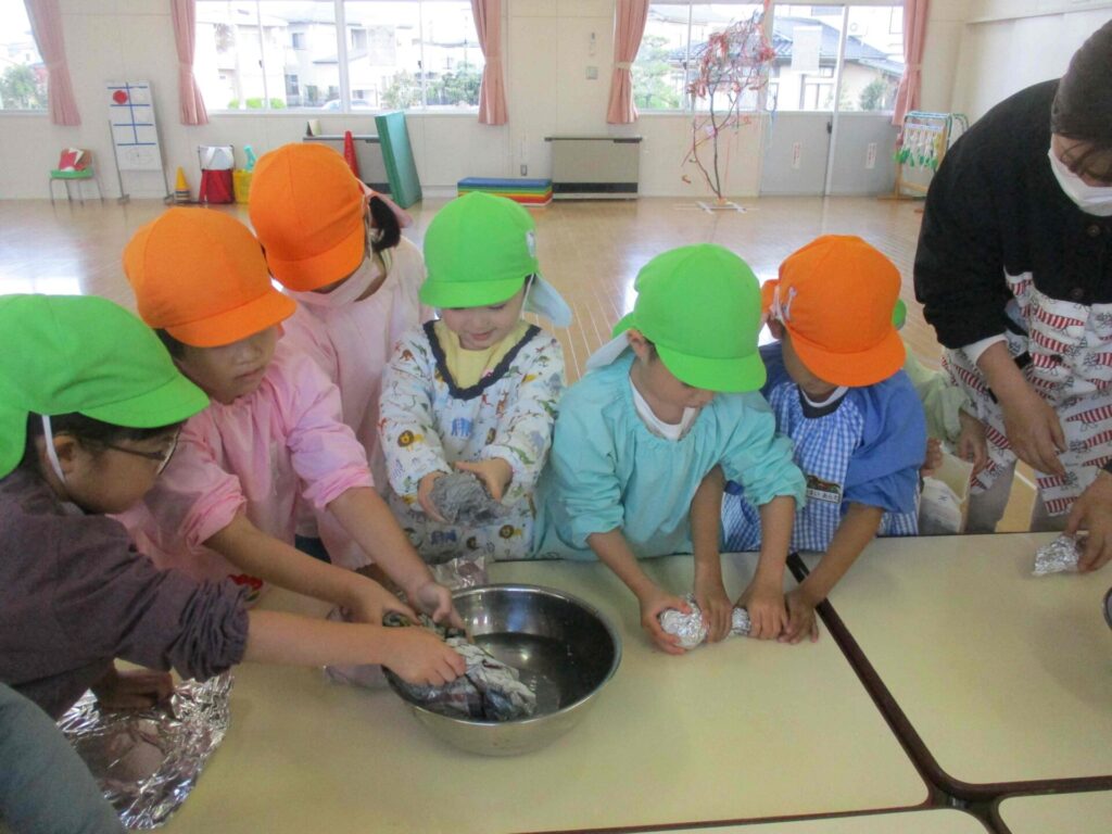 「お芋を洗って焼き芋の準備をしているんだよ。」