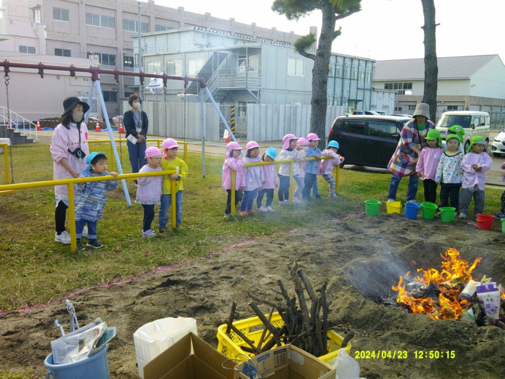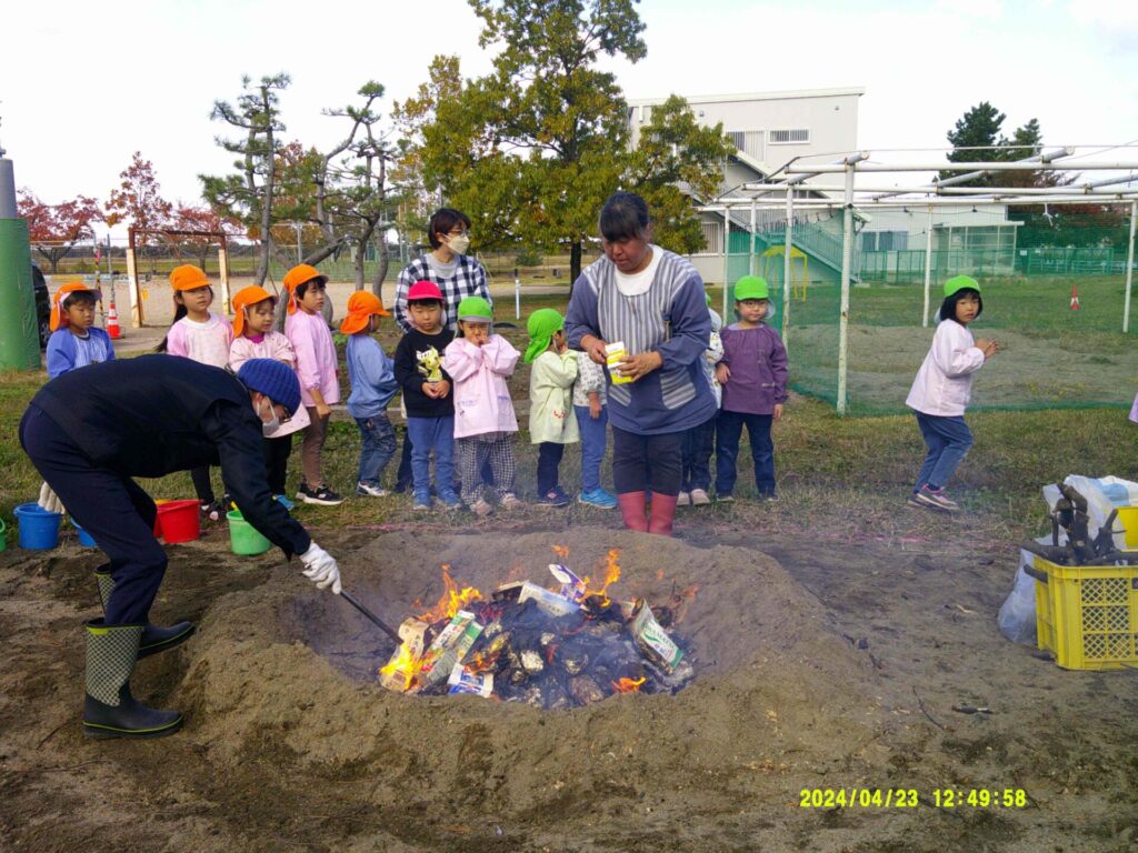 園庭では、先生たちが、みんなが集めた木や葉っぱを燃やして焼く準備をしていてくれました。