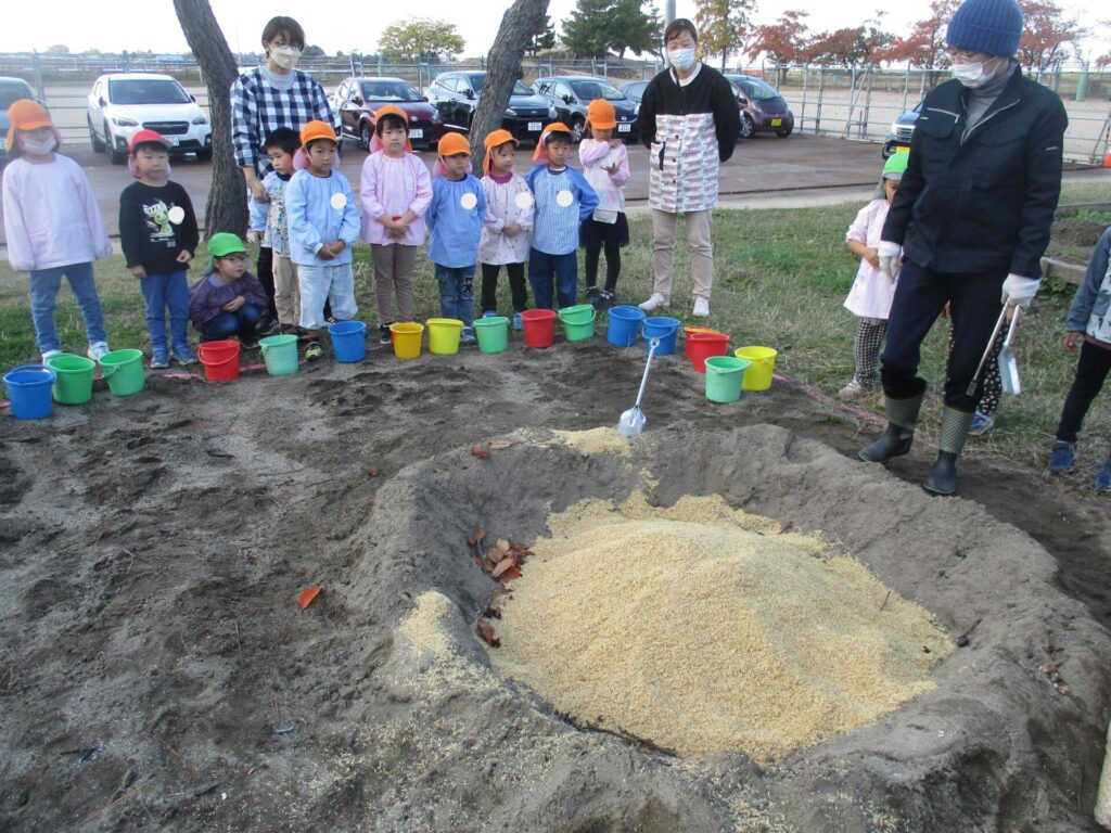 最後に、“もみがら”というお米の殻をかぶせて蒸し焼きにします。