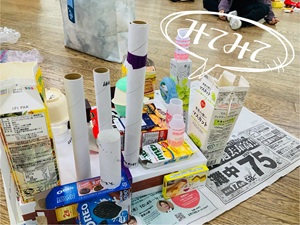 ランチルームに立ち寄ると一年生が一生懸命箱や筒をくっつけていました。「先生見て見て!これ何に見えますか?」「先生、ロボットを作ったんだよ」キラキラした目で自慢の作品を紹介してくれました。みんながんば …
