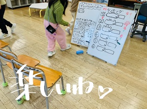 2年生はグループに分かれて楽しい出店作りをしていました。試行錯誤を重ねながら作った出店は自信作。「先生やってみてください」と嬉しそうに声をかけてくれました。