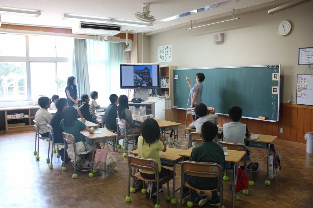9月1日(月) ALTのAko先生と一緒に授業を行いました。 夏休み中に訪問した海外の様子を動画や写真を使って英語で楽しく伝えてくださいました。 子どもたちは、日本との違いに興味津々でした。