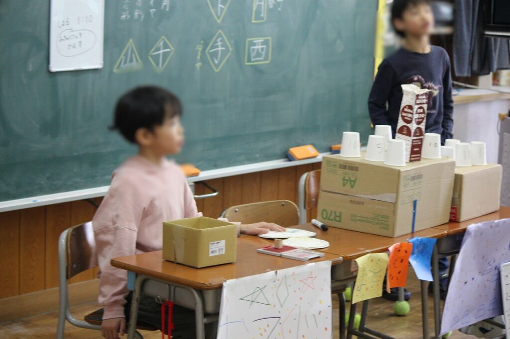 校舎展示(1年生) 1年生は、授業で学びつくったものを素敵に飾ってます。 図画工作でつくった作品をミニ展示 11月12日(水)ものづくり体験 1・2年生合同で、卵パックを利用した「ものづ …