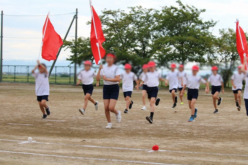 今年度のスローガン「つなごう150年のバトン みんな笑顔で未来へ走ろう!」を宣言し、いよいよ150周年記念運動会の始まりです!