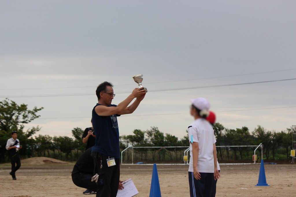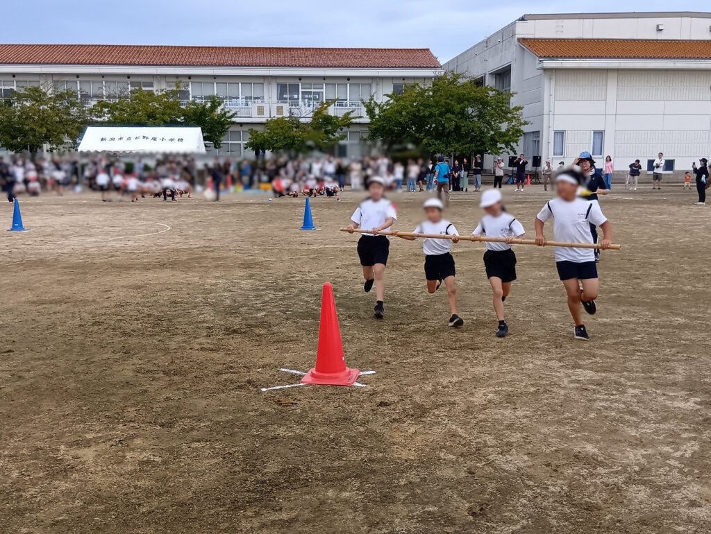 今年度のなかよし班競技は、150周年にちなんだ「みんなで嵐を起こせ!松野尾タイフーン」でした。なかよし班で力を合わせて、竹の棒を運びました。優勝チームには、記念種目として新調した優勝カップが贈られました。
