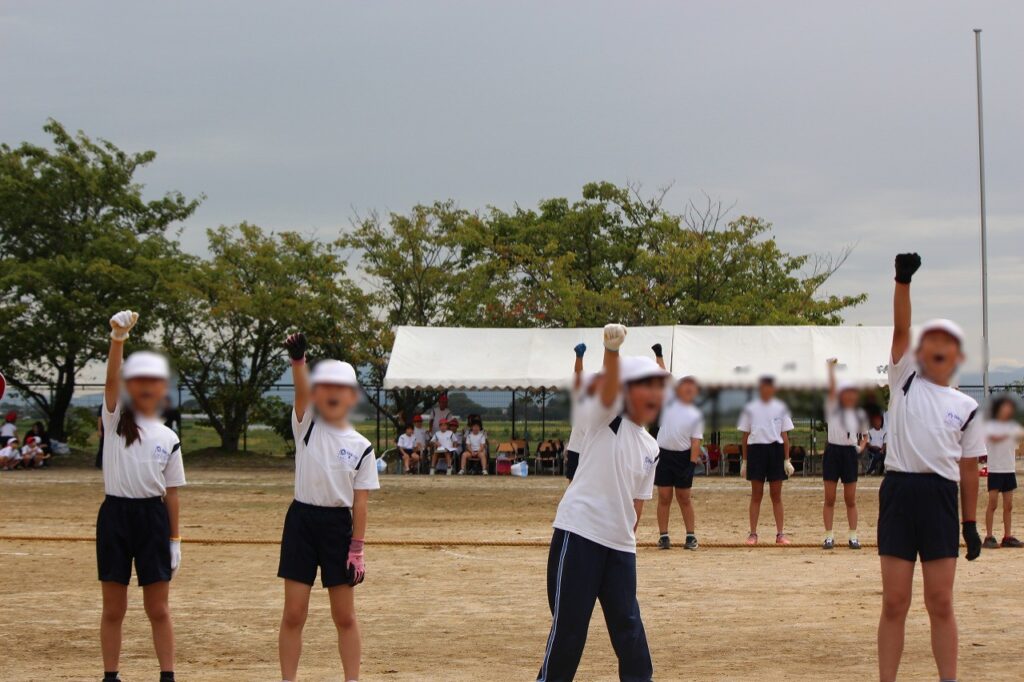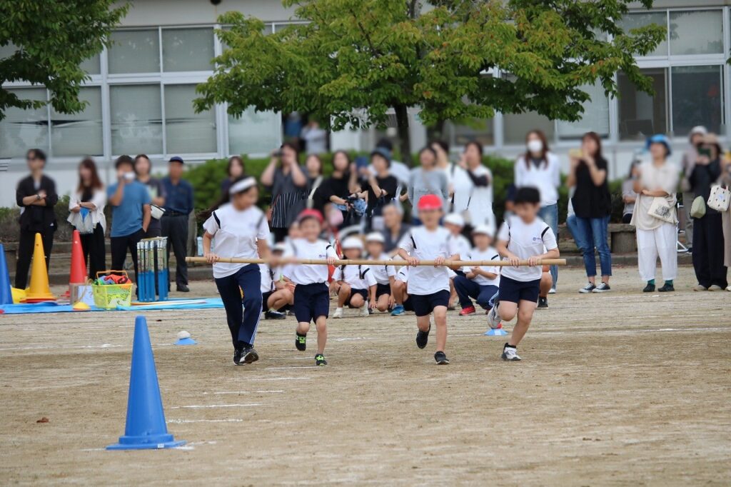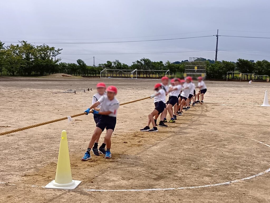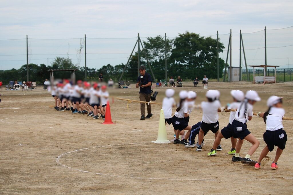 3・4年生の「お助けつな引き」は、4年生が応援歌を歌った後にかけ付けるオリジナル競技。3年生が頑張って引いている綱に4年生が加わるとさらに迫力が増しました。
