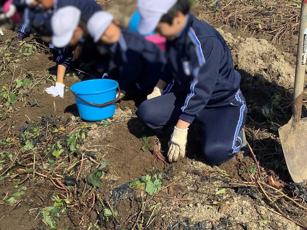 縦割り班活動(なかよし班)で、全校芋ほりをしました。