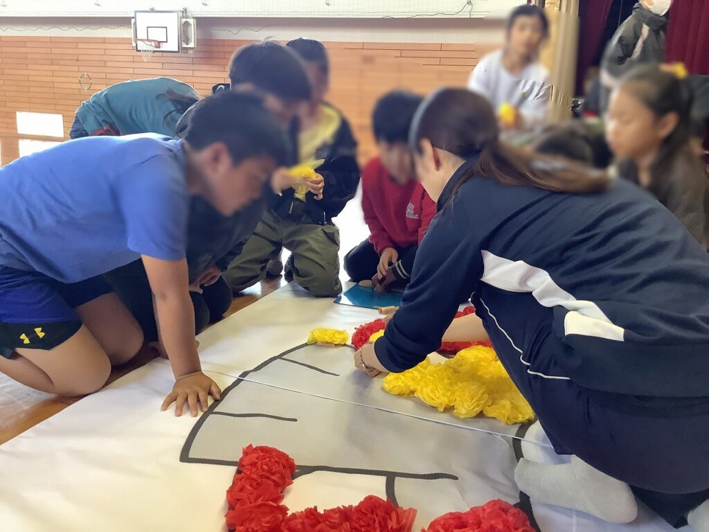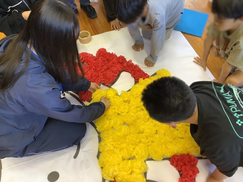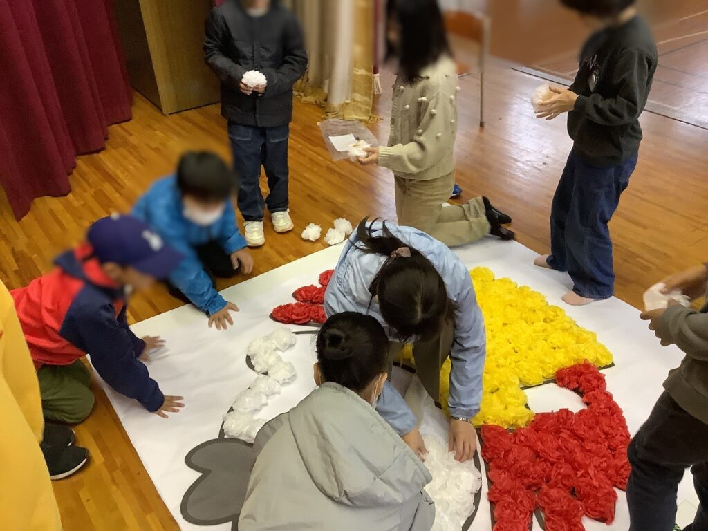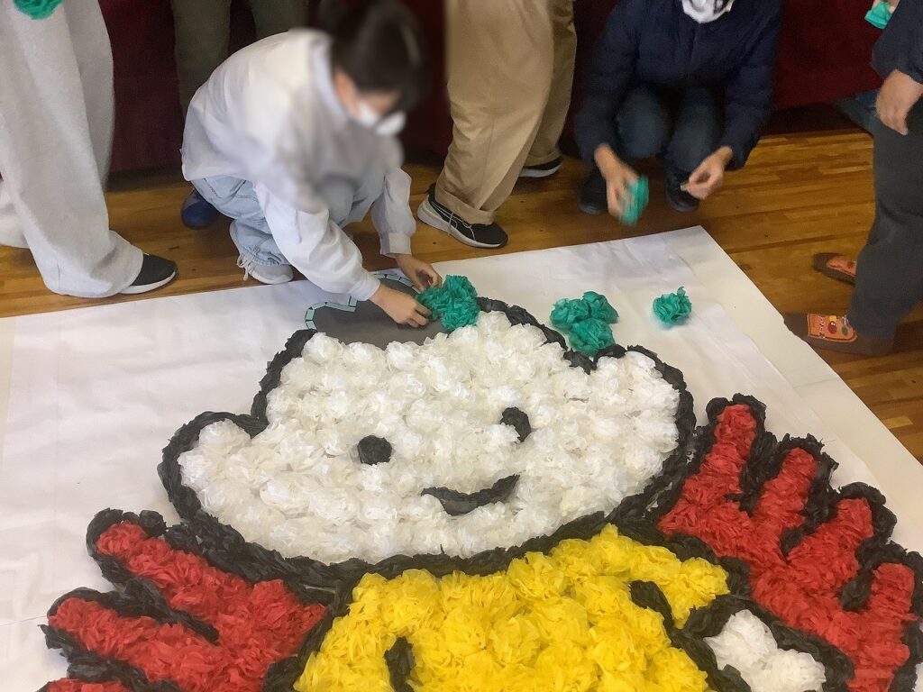 たくさんのお花を作成した後、班ごとに大きな「まつおくん」を作成するために、一人一人願いを込めてお花を飾り付けました。色とりどりのお花が飾られる度に、「まつおくん」が彩られていく姿に子どもたちも感動をしていました。