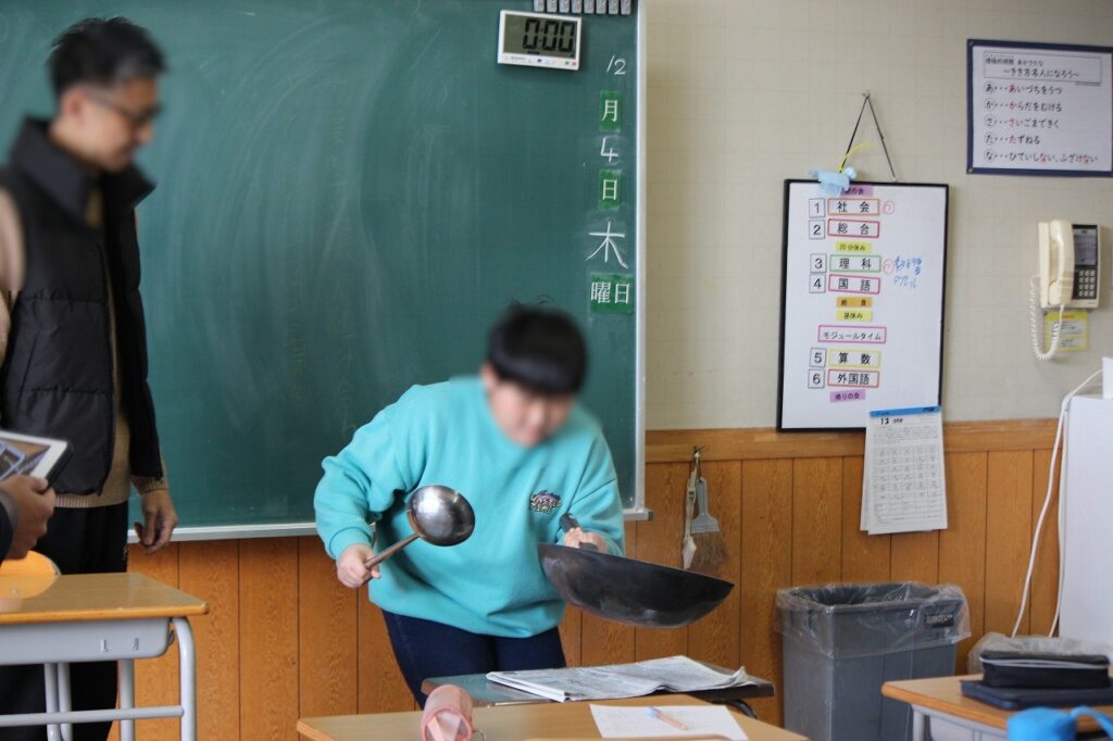 実際に中華鍋を振る体験をして、その重さに子どもたちも驚いていていました。