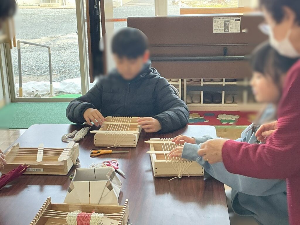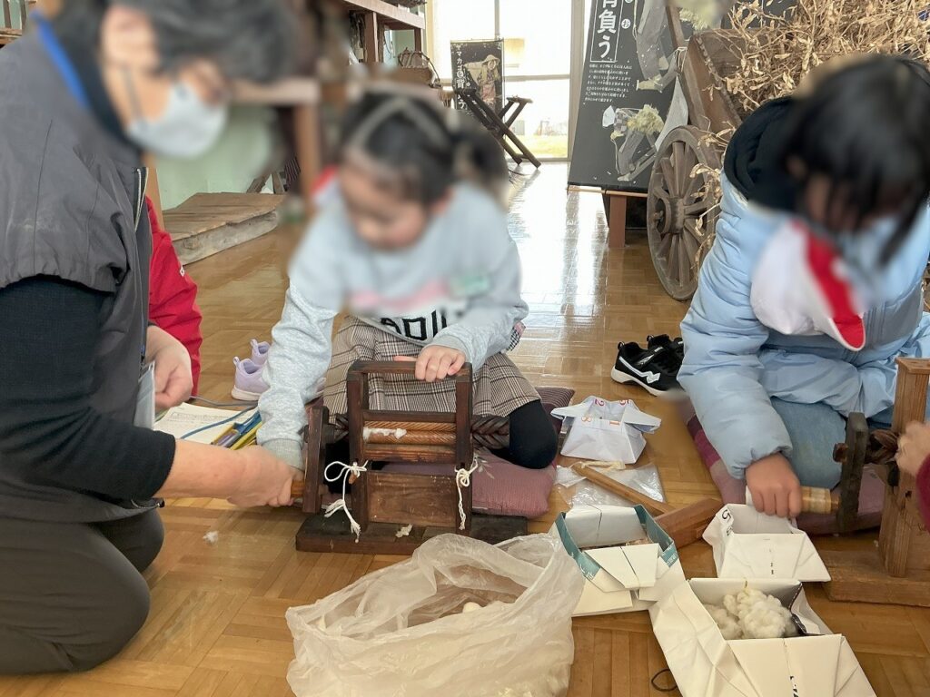 「のぞきからくり」や昔の農具・衣服等を見学、綿づくりやきなこひき体験等、たくさんの活動をしました。