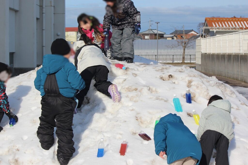 カラフルな色みずを真っ白な雪山に置き、様々な想像を膨らませていました。