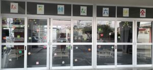 スローガンが自動玄関に掲示されました。思いをひとつに取り組みます。