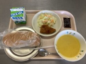 献立 コッペパン チョコクリーム かぼちゃのポタージュ ポテトとお米のささみカツ コールスローサラダ 牛乳 今日は月に1回のパンの日です。 「1週間前から楽しみにしていました」と 少なくなったパン給 …