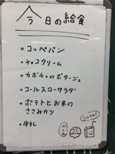 ある学級ではホワイトボードに今日の献立をステキに書いて