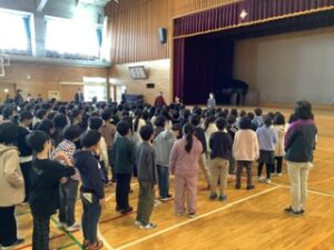 校歌を歌い,校長講話では先月行われたミュージックタイムの互いの頑張りを振り返りました。
