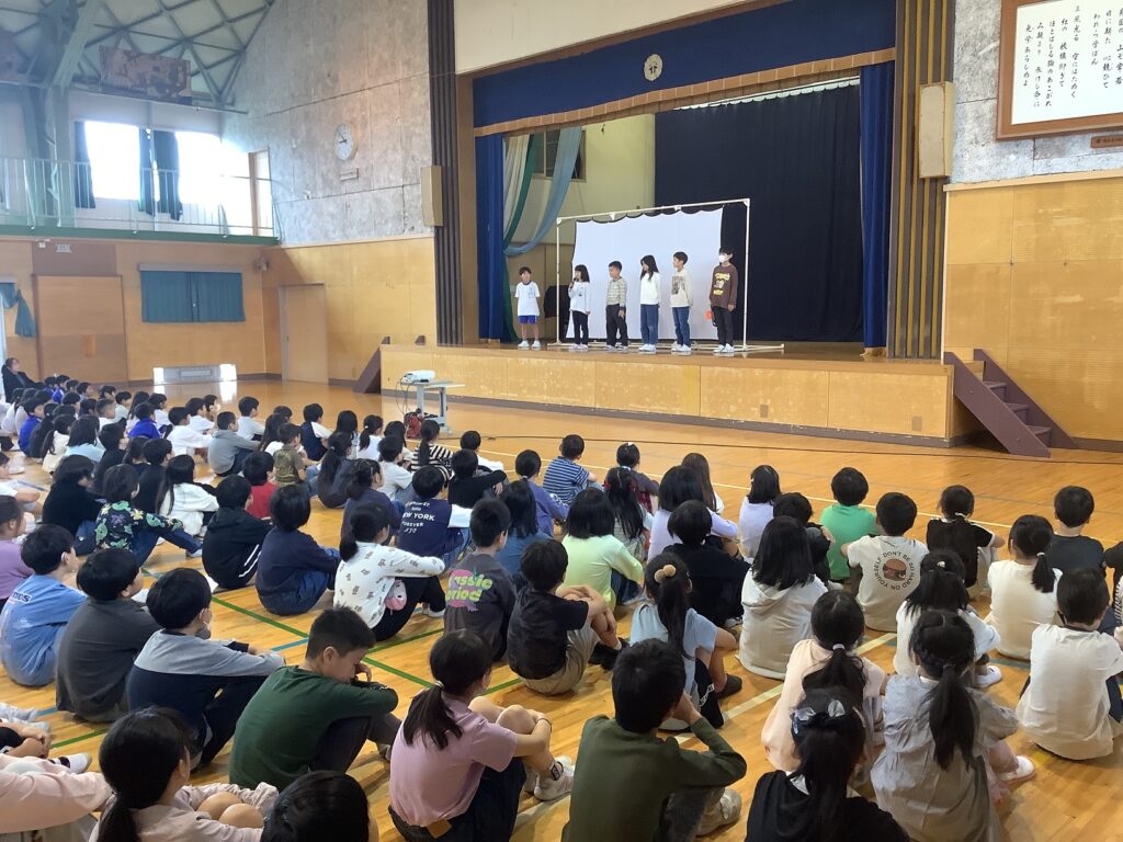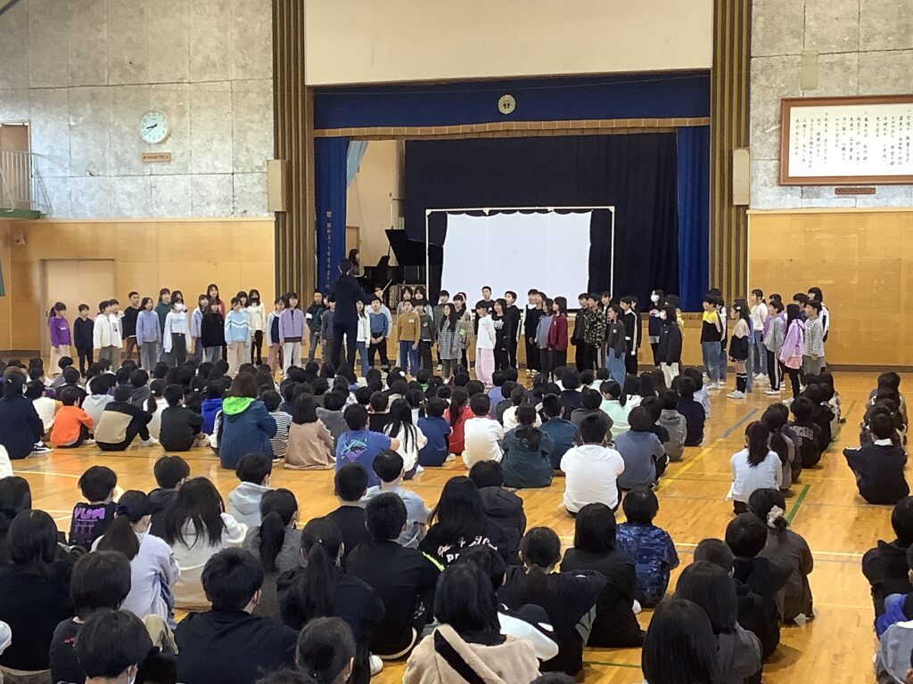 11月4日(火)の全校朝会で4年生が、木崎小学校オリジナルソング「木崎は羽ばたく」を披露しました。11月5日に行われるにじいろ音楽祭のリハーサルと全校児童への披露を兼ねての発表でした。体育館は4年生 …