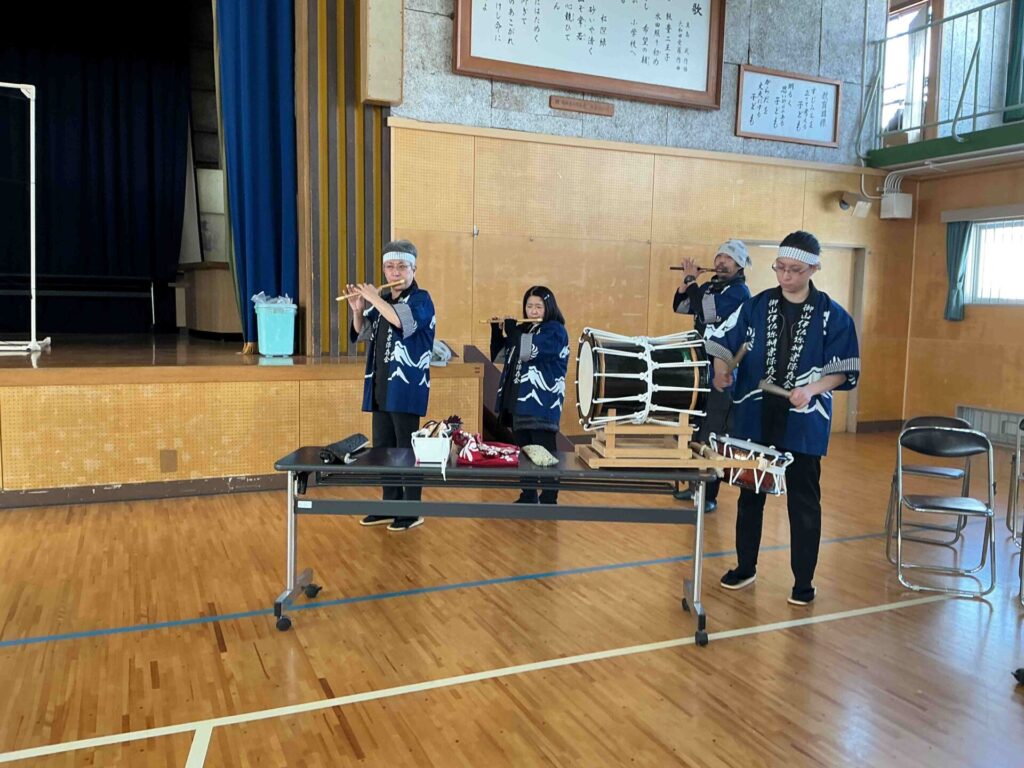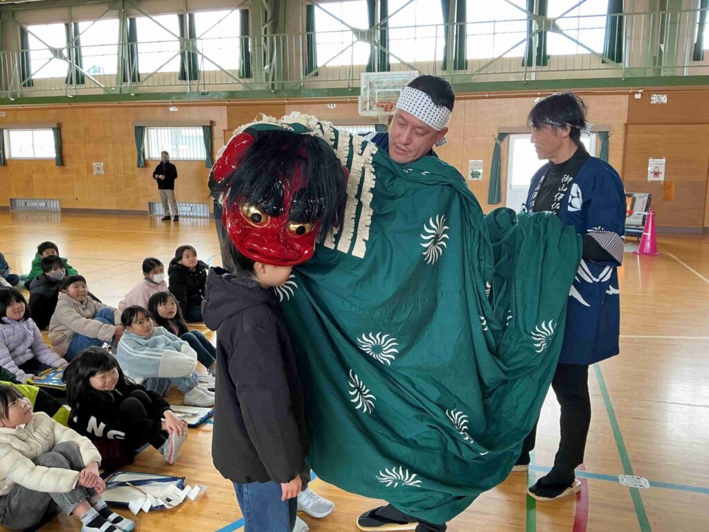 1月21日(水)に、3年生の総合的な学習「木崎に伝わる行事」で、神楽保存会の皆様にお越しいただきました。子どもたちは、尾山伊座弥神楽を実際に見て、大喜びでした。また、神楽体験にも取り組みました。