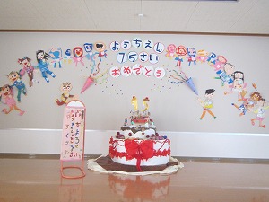 一幼祭 幼稚園の75さいの誕生会をしました。幼稚園が木造の一小校舎の1階にあったころ、そして子どもたちが白いエプロンの園児服を着ていたころの写真を園長先生が見せてくれました。 年長さんの進行で子ど …