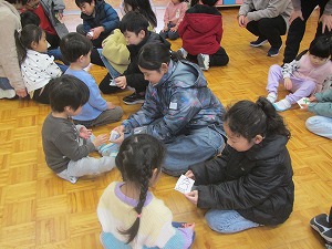 昼休みに新津第一小学校の2年1組の皆さんが遊びに来てくれました。幼稚園の子どもたちと一緒に遊べるように…と一人一人が手作りおもちゃを持っています。園児と小年生で2~3人のペアを作り、はじめに小学生が遊 …