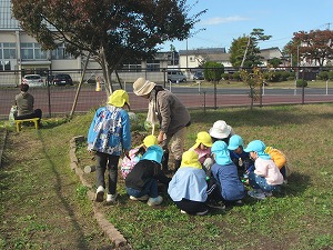 先生の手本を見た年長もみじ組が,年中すみれ組にやり方を教えてくれました。