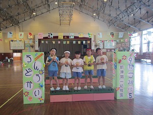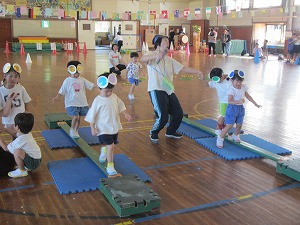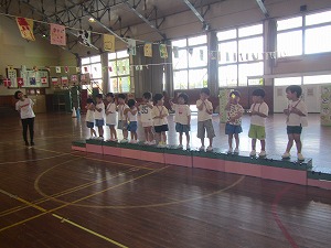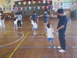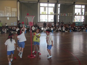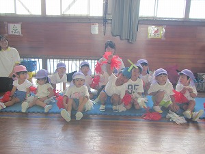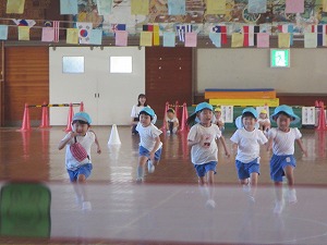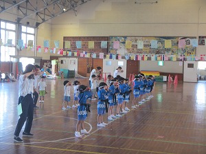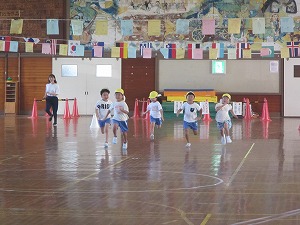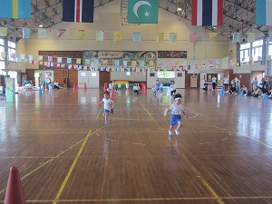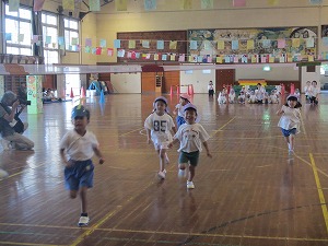 運動会を行いました。会場の一小体育館には園児のお父さんお母さん、祖父母や小学生、修了した1年生、お客様が大勢応援に来てくれました。 今日は園児22名が全員参加です!開会式やかけっこ、普段の遊びがたくさん詰まった興味走や親子競技に元気いっぱい取り組みました。