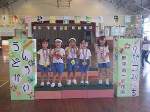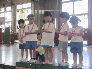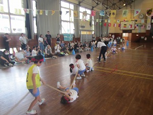 最後の競技は年長児と年中児による「玉入れ」「綱引き」「リレー」対決の三種競技です。10人で毎日のように競い合い、悔しさもうれしさもたくさん味わってきました。今日はなんと!同点で引き分けの結果となりました。みんな、頑張ったね!子どもたちの成長を感じた運動会でした。運動会に来てくださった皆様、ありがとうございました。