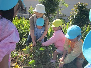 さつまいも畑で土にふれてたくさん遊んでから、年長児と年中児はさつまいもの葉っぱの茎の皮むきをしました。