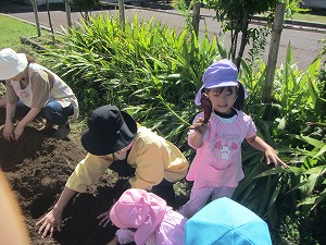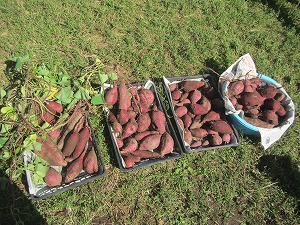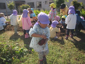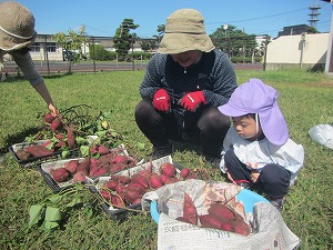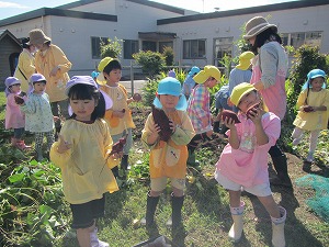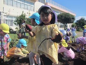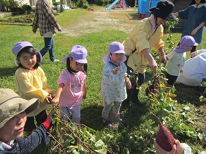 おいものつるを「うんとこしょ、どっこいしょ!」と引っ張ります。「あれ、おいもはどこかな!?」・・・