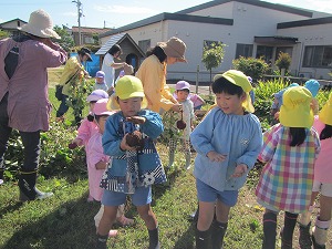 朝の雨が上がり、子どもたちが登園するころには虹がかかり青空が広がってきました。今日はおいもほり!張り切って長靴で登園した子どもたちです。
