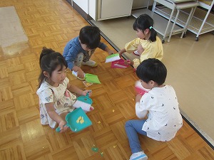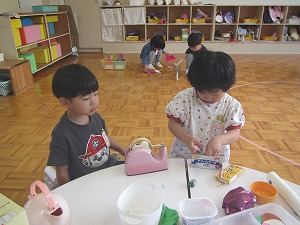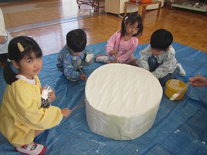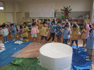 子どもたちは、朝から幼稚園の誕生会の準備に大忙し!年長組の部屋では大きなケーキに年長・年中の子どもたちがクリームを塗っていました。「楽しそう!」と年少さんもケーキ作りに参加して、クリームたっぷりの大きなケーキ(の土台)ができました!「やったぁ」これからどんな飾りを付けるのかな…ただいま相談中です。