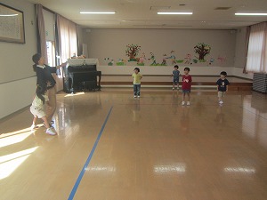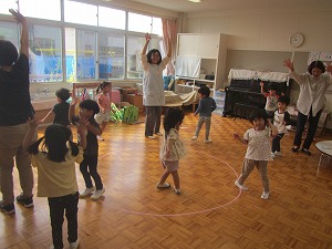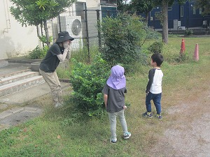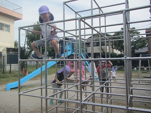 よい天気になりました。外遊びにもちょうどよい気候です。年少組は園庭でかくれんぼをしたり、ジャングルジムや滑り台をしたりして、たっぷりと遊びました。