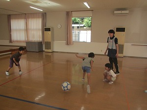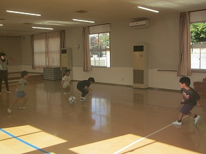 年長組は最近ドッジボールに夢中です。教育実習生と一緒に汗びっしょりになって楽しんでいました。また続きをしようね。