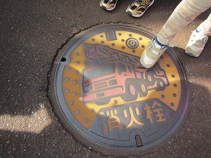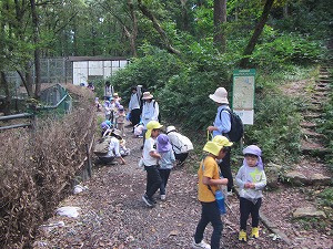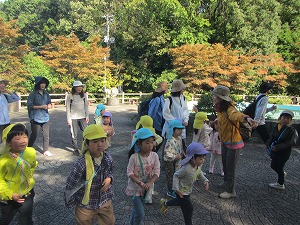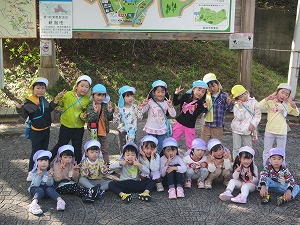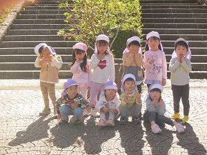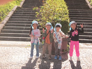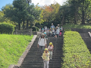 好天に恵まれ、全園児で秋葉山に園外散歩に出掛けました。道中珍しい消火栓の蓋を発見!大喜びの子どもたちでした。噴水広場で休憩してから、たくさん階段をのぼって行きました。階段の上から見ると遠くにニトリの看板が見えました。
