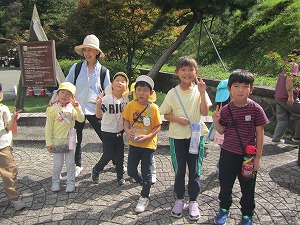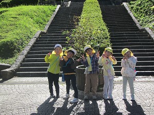 帰り道、松ぼっくりとどんぐりがたくさん落ちていました。「こっちにもある」「どんぐり、帽子がついてる」「見て見て、みどりのどんぐり!」…夢中で拾い集め、大事に持って幼稚園まで戻ってきました。