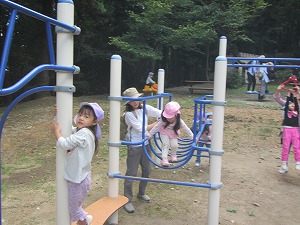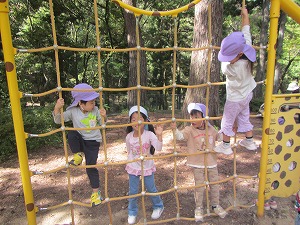 秋葉山の鹿を眺めながらアスレチック広場に向かいました。アスレチックで体を動かしてたくさん遊びました。ちょっと難しそうなことにも、目を輝かせて果敢にチャレンジしていく子どもたちの姿が素敵でした!