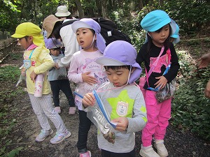 幼稚園までの帰り道、少しくじけそうになりながら、3歳児も満3歳児も最後まで歩き通しました!子どもたちのたくましさにびっくりしました。