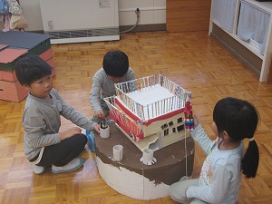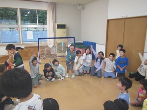 雨の一日です。小学区の昼休みに3年1組さんが幼稚園に遊びに来てくれました。年少組は保育室で、触れ合い遊びを3年生と一緒に楽しみました。