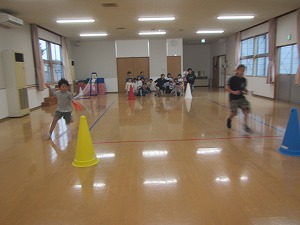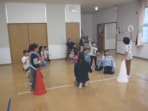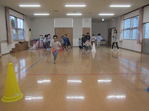 年長・年中組は、子どもたちのリクエストでリレーごっこです。くじ引きで赤白2チームに分かれて、真剣勝負をしました。さすが3年生!速い速い!負けじとくらいつく幼稚園の子どもたちも素敵でした。