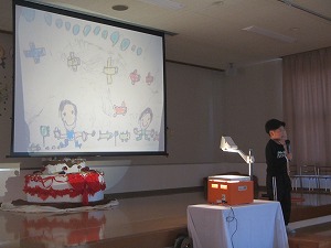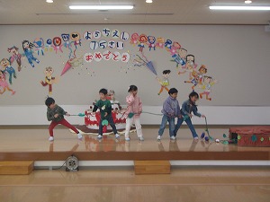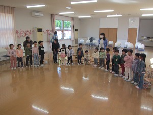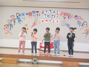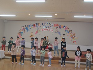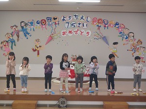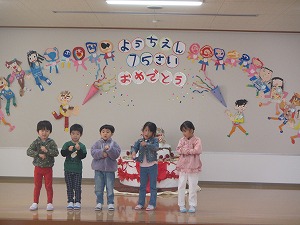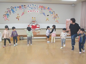 当日は子どもたちと園の職員、そしてお家の方々や幼稚園のお客様と一緒にお祝いします。後半はゲストにひかりおんがく隊の方をお呼びしています。