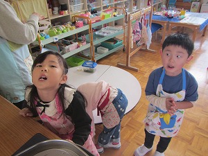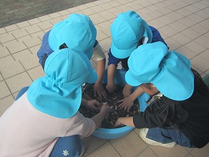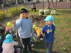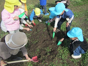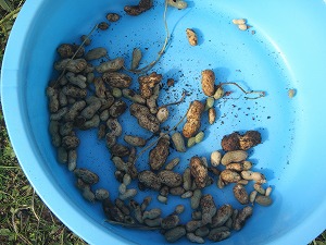 春に苗を植え水やりをしてきた畑を、今日年中・年長児が掘り起こすと…「見つけた!」「こっちも!」と歓声があがりました。出てきた実は落花生です。見たことがないほど大きなもの、赤ちゃんサイズのもの、外皮が食べられているものもありました。「何がたべたんだろう?鳥かな、虫かな…」と残念そうな子どもたち。「あっミミズがいる!」掘りだした落花生の実と一緒にミミズが顔をだしました。ミミズもおいしいものが分かるのですね。