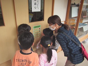 先日、堀出神社への園外散歩で捕まえた「かなへび」に名前を付けてかわいがっている年長組です。餌になりそうな虫も一緒に飼育ケースに入れて飼っているのですが、幼稚園の絵本の部屋では、かなへびの飼い方が載っている絵本が見つけられませんでした。「小学校ならあるんじゃない?」と、新津一小のもみじ図書館に行きました。職員室の前に「職員室の入り方」が分かりやすく貼ってありました。中庭では体育の授業中です。園児のお姉ちゃんが気づいて手を振ってくれました。