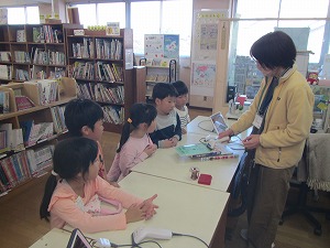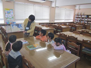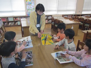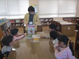 一小のもみじ図書館に入ると司書の渡部先生が木の机と椅子のところに子どもたちを案内してくれました。なんと!4冊もかなへびに関する絵本はあり、中の1冊はまだ小学生が借りたことのない新しい「飼育と観察」の図鑑でした。司書の先生に読み聞かせをしていただきました。最後に絵本についているバーコードをピッと機械に通して大切な絵本を特別に幼稚園の子どもたちに貸し出してくださいました。大喜びの子どもたちです!先週小学校に就学時健診でうかがった子どもたちは、小学校の校長先生と教頭先生に挨拶をして幼稚園に帰りました。子どもたちにとって、小学校がより身近な場所になりました。ありがとうございました。