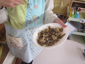 年中組がきれいに洗って、食べられる落花生と、(何かに食べられていて)食べられない落花生に分けてくれました。給食の時に、先生がゆでてくれた落花生を食べました。市販の落花生(ピーナッツ)とは違った食感を味わいました!